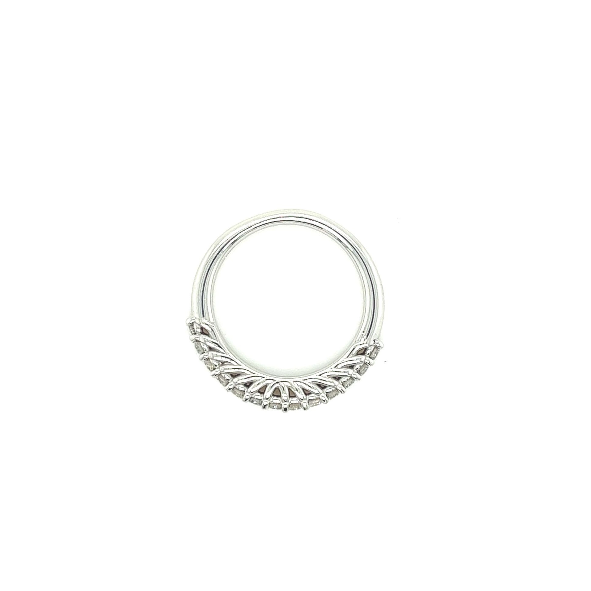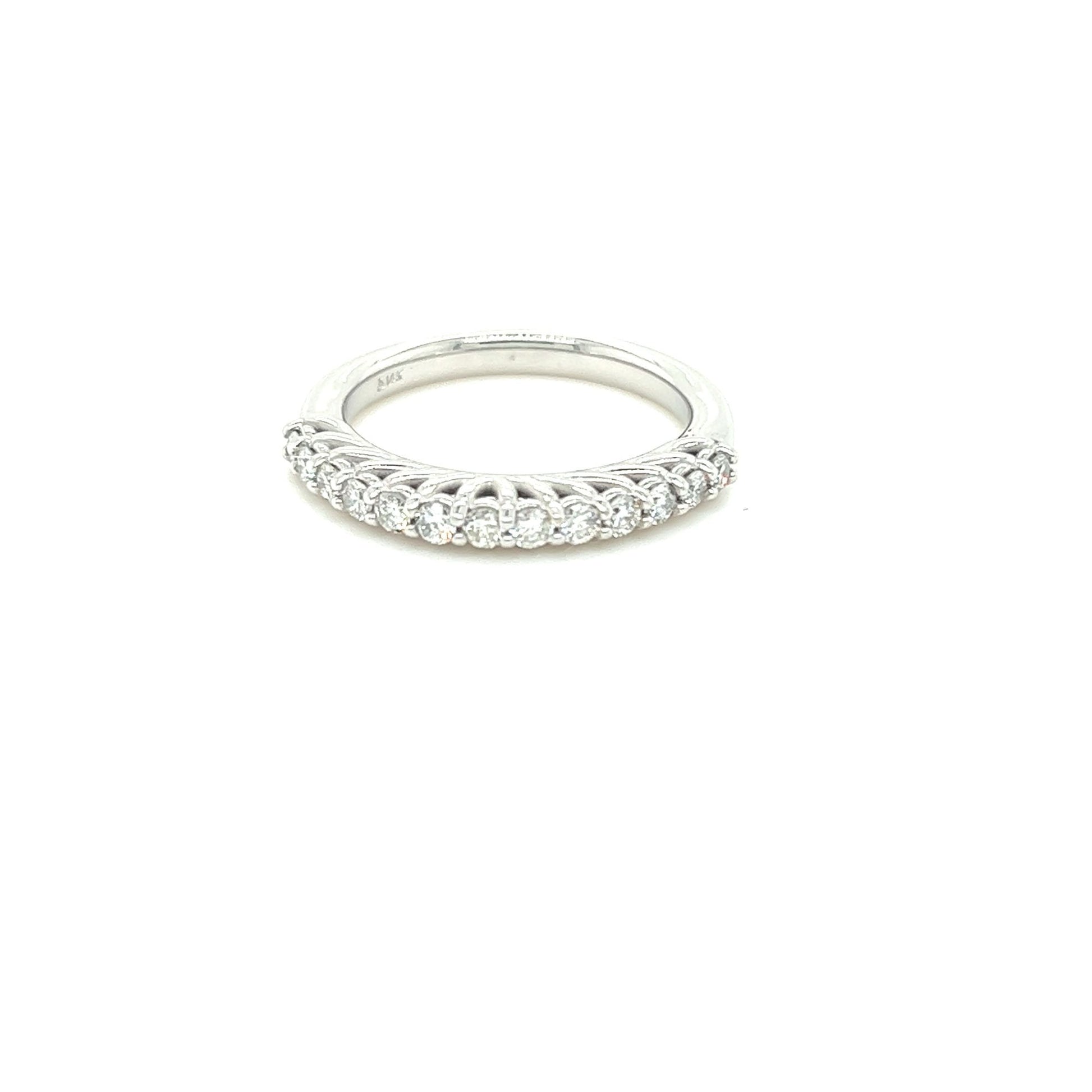 The design of this band is simple yet classic, with 13 round diamonds set in a row. The white gold setting provides a beautiful contrast against the sparkle of the diamonds, making for a truly stunning piece.