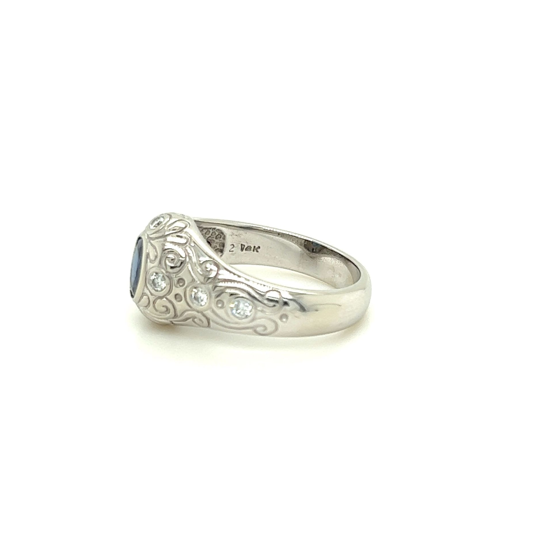 14kt White Gold Bezel Set Oval Sapphire Ring w/ Flush Set Diamonds