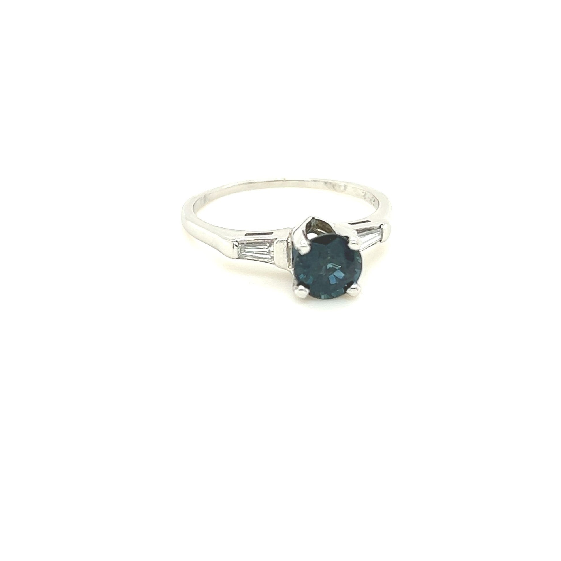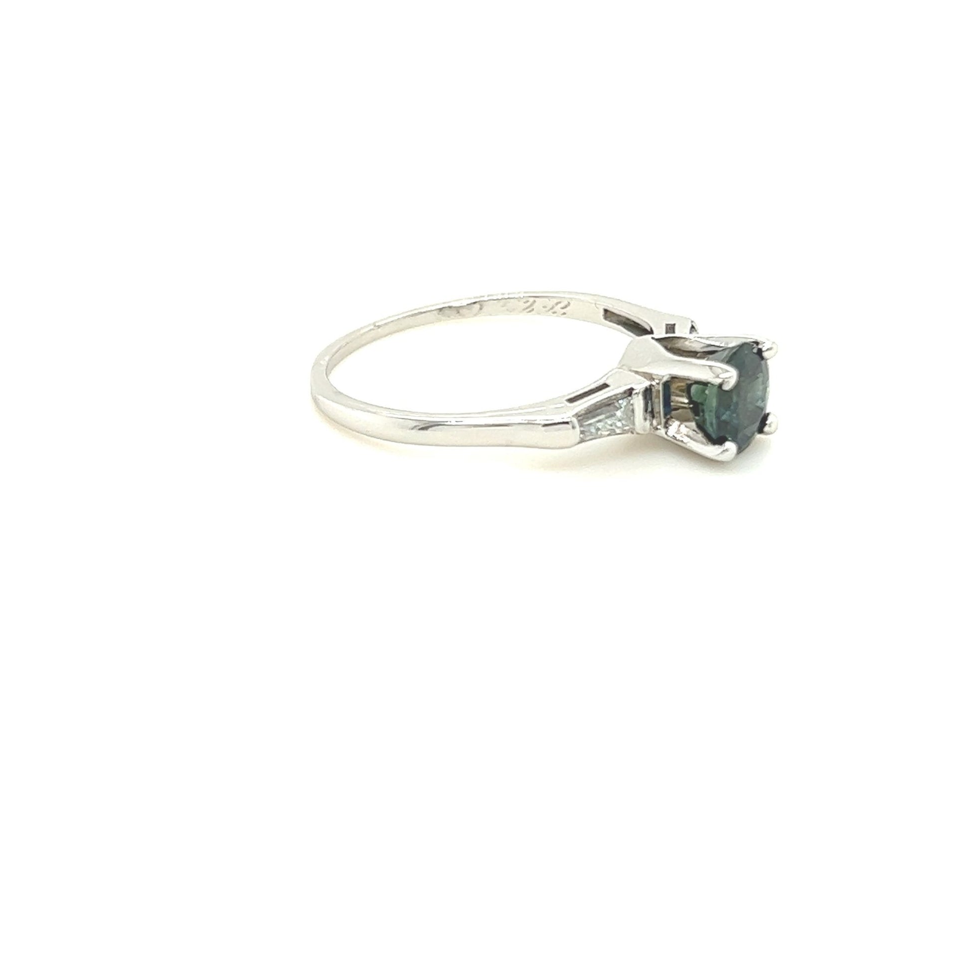 This stunning 14kt white gold ring features a mesmerizing 1.13 carat blue and green sapphire center stone, surrounded by a halo of sparkling baguette diamonds weighing .2 carats in total. The elegant design of the ring is further enhanced by the sleek and slender 2-gram band, available in size 6 3/4.