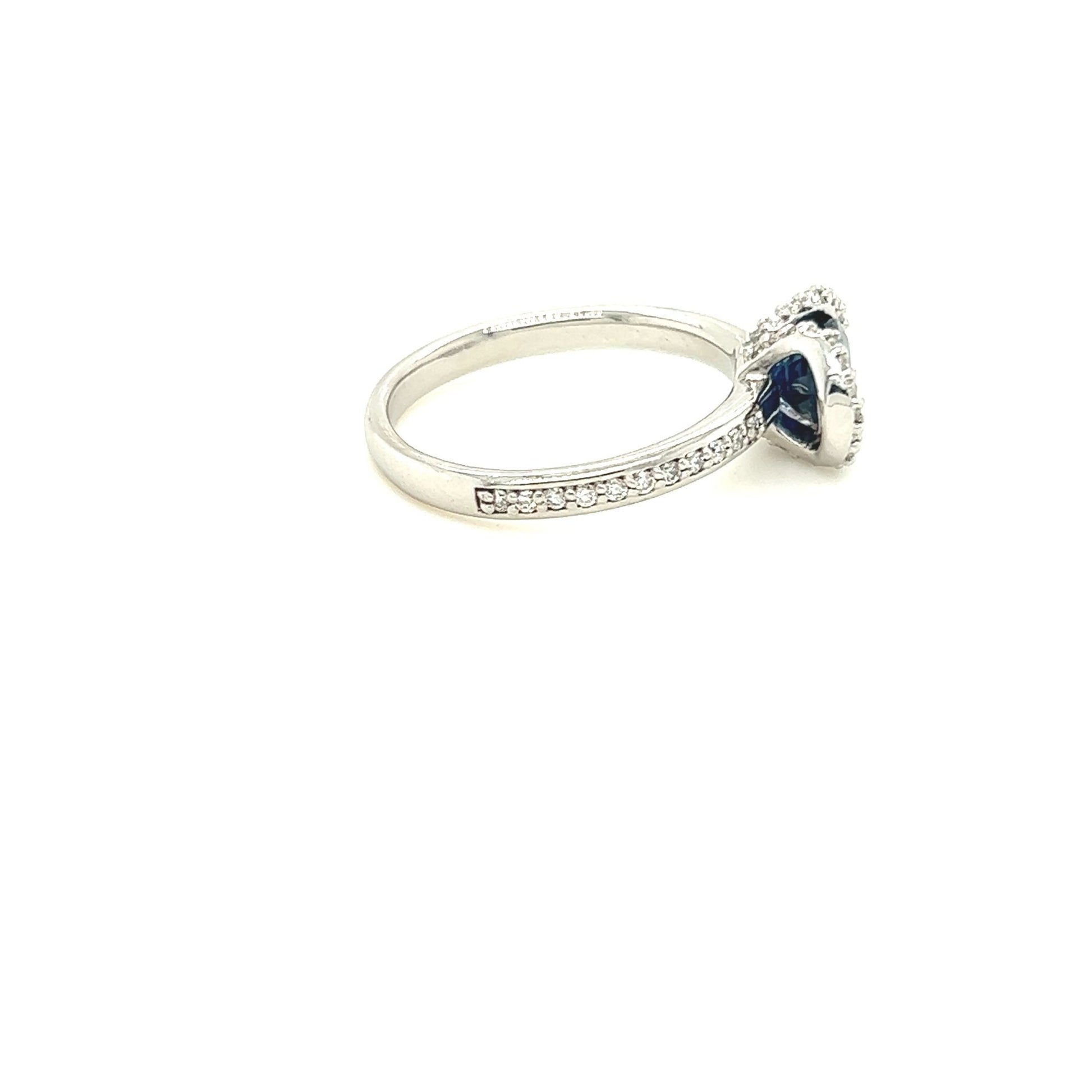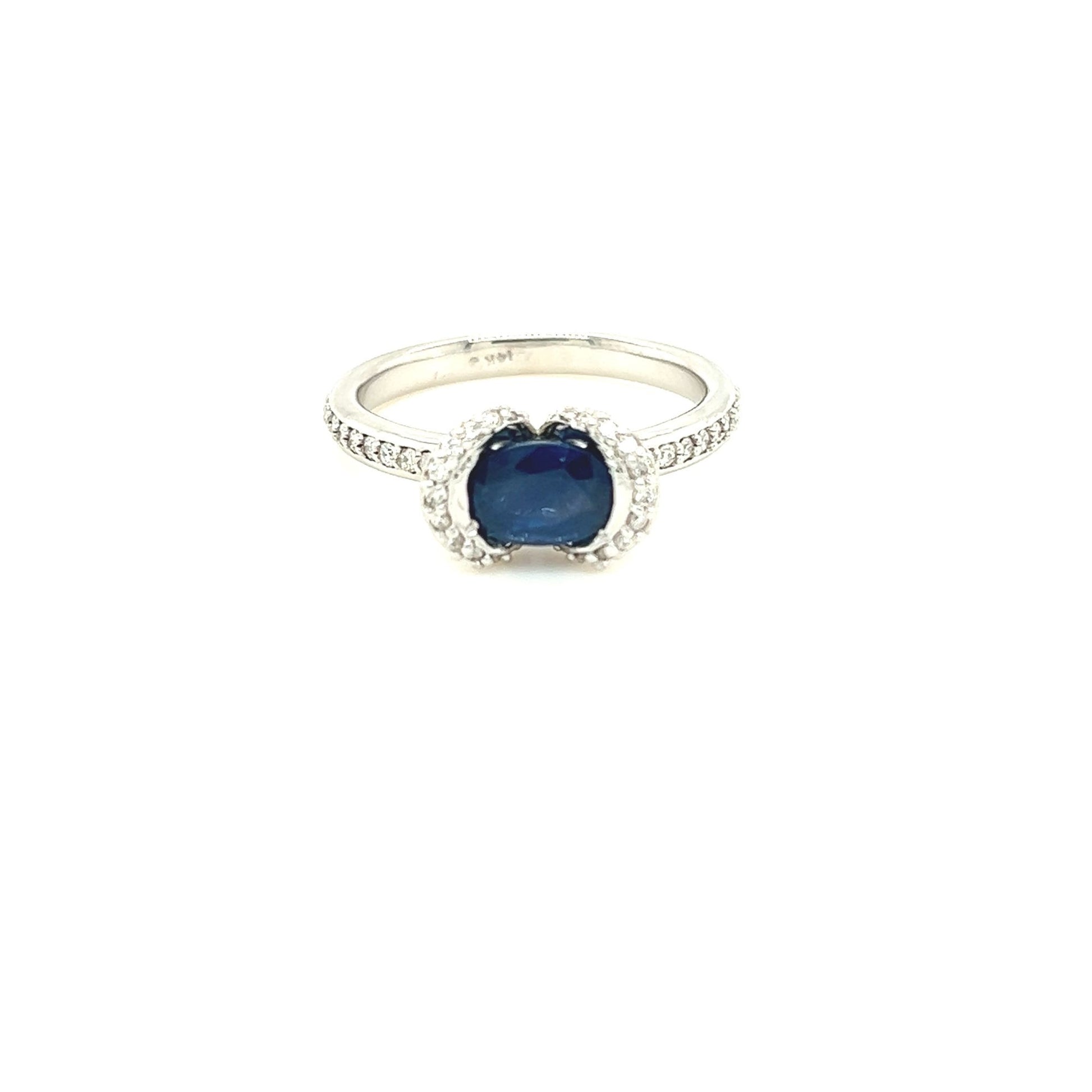 The ring weighs 3.8 grams and is available in size 6 1/2. The intricate design of this ring and the combination of blue sapphire and diamonds make it a true statement piece, perfect for any occasion.