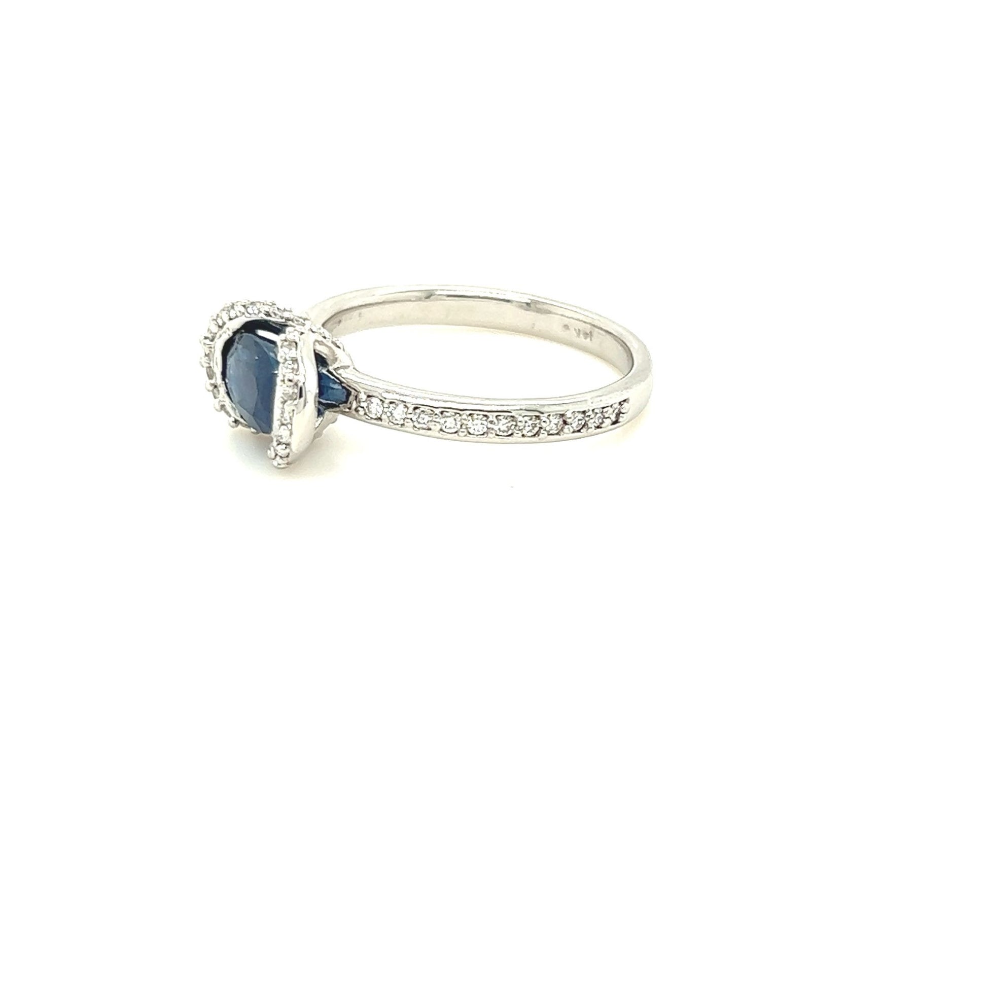 This stunning 14kt white gold ring features a gorgeous blue sapphire center stone, horizontally set in a unique half-bezel setting, which adds a modern and elegant touch to the piece. The sapphire is beautifully complemented by the sparkling diamond accents that extend down the sides of the band, totaling .25 carats.