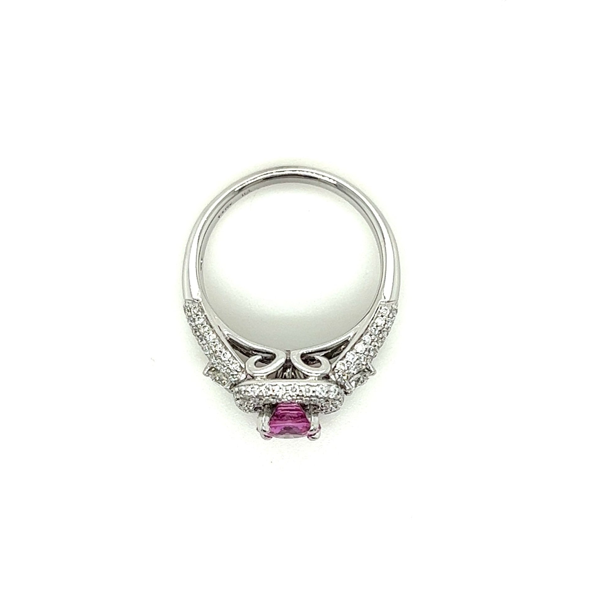 This exquisite 14kt white gold ring is a true statement piece. The stunning pink sapphire at the center of the ring is brilliantly cut and surrounded by a halo of sparkling diamonds, totaling 1.2 carats. The channel set diamonds on the band add additional elegance and sophistication.