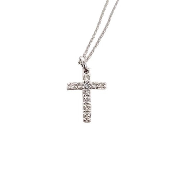 Embrace your faith with this elegant 14kt White Gold Small Diamond Cross Pendant, featuring a delicate cross adorned with a total of 0.19 carats of sparkling diamonds. This petite yet meaningful pendant has a weight of approximately 1 pennyweight (dwt).