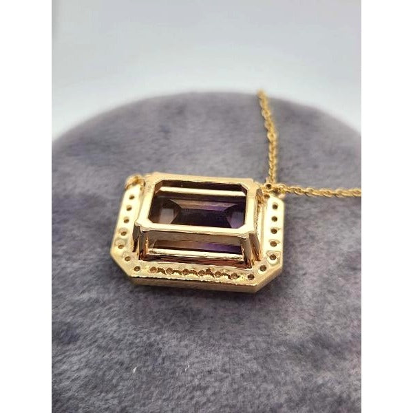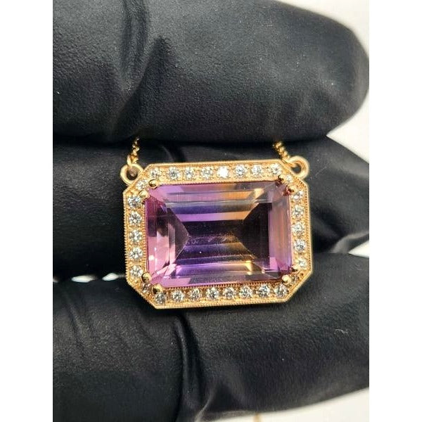 The centerpiece of this pendant is the Ametrine, a unique and rare gemstone that combines the vibrant purple hues of Amethyst with the golden glow of Citrine. The 11.64 carat Ametrine is expertly prong-set, allowing its mesmerizing color play to take center stage. The gemstone's dual personality, transitioning from purple to gold as it catches the light, adds an enchanting touch to the pendant.