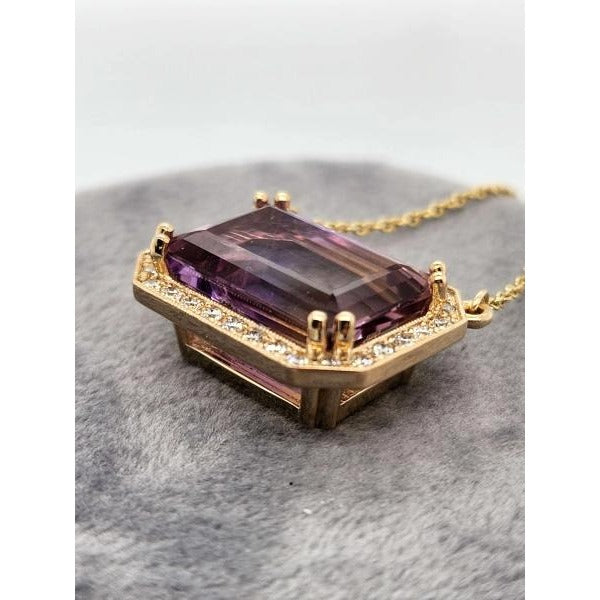 This Ametrine and Diamond Pendant is a stunning statement of individuality and sophistication. Whether worn for special occasions or as an everyday accessory, it exudes elegance and charm. It can be a symbol of transformation and balance, reflecting the Ametrine's unique dual colors. This pendant is a remarkable piece of jewelry that will undoubtedly capture the hearts of those who appreciate fine craftsmanship and the beauty of rare gemstones.