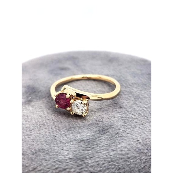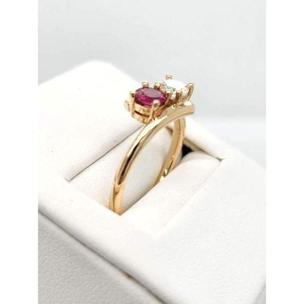 This exquisite ring is a symbol of timeless love and elegance, featuring two dazzling gemstones set in 14kt yellow gold. The ring showcases a stunning pair of gemstones, including a total of 0.28 carats of vibrant rubies and 0.30 carats of sparkling diamonds, all skillfully set in a prong setting.