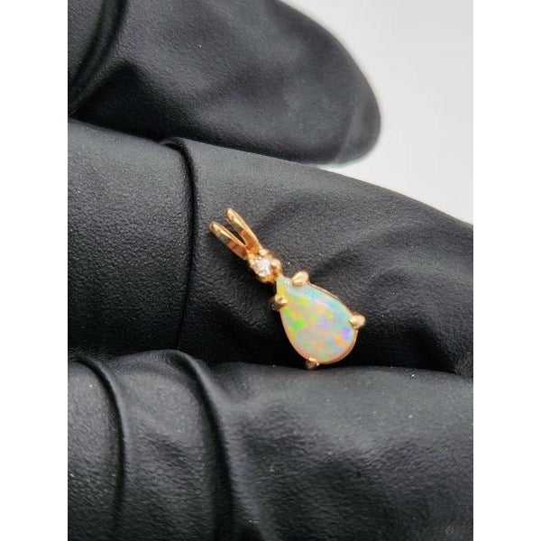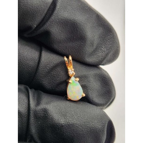Elevate your style with this exquisite 14kt yellow gold pendant, featuring a pear-shaped opal gemstone measuring 8x5 millimeters. The pendant also boasts a delicate .04 carat diamond accent, all beautifully crafted and weighing approximately 0.5 pennyweights (dwt).