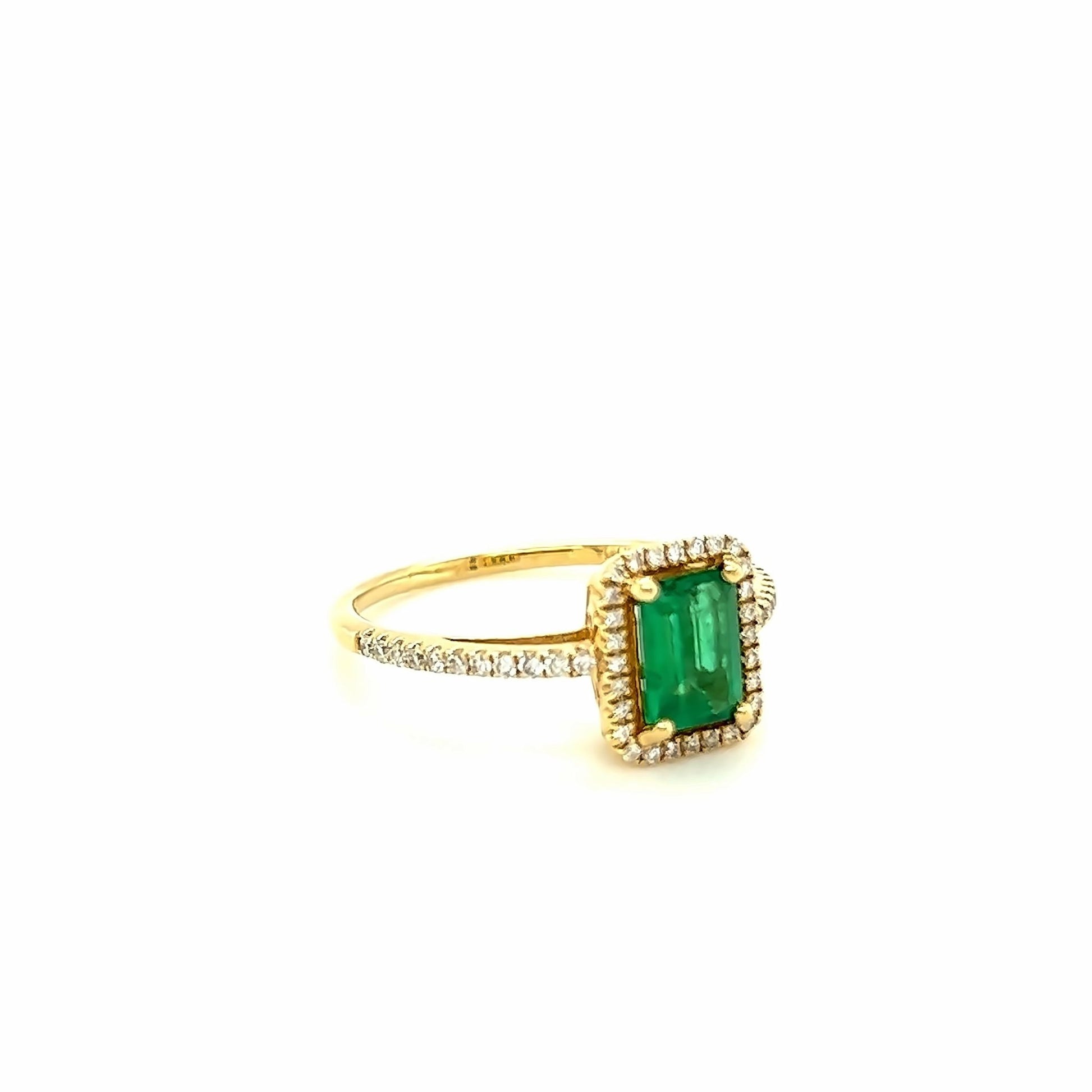 The 7x5 emerald is the highlight of this piece, with a total carat weight of 1 ct, adding a touch of elegance and sophistication to this beautiful ring. The .5 ct diamond accents create a beautiful halo around the emerald, adding just the right amount of sparkle and shine to this unique and stunning design.