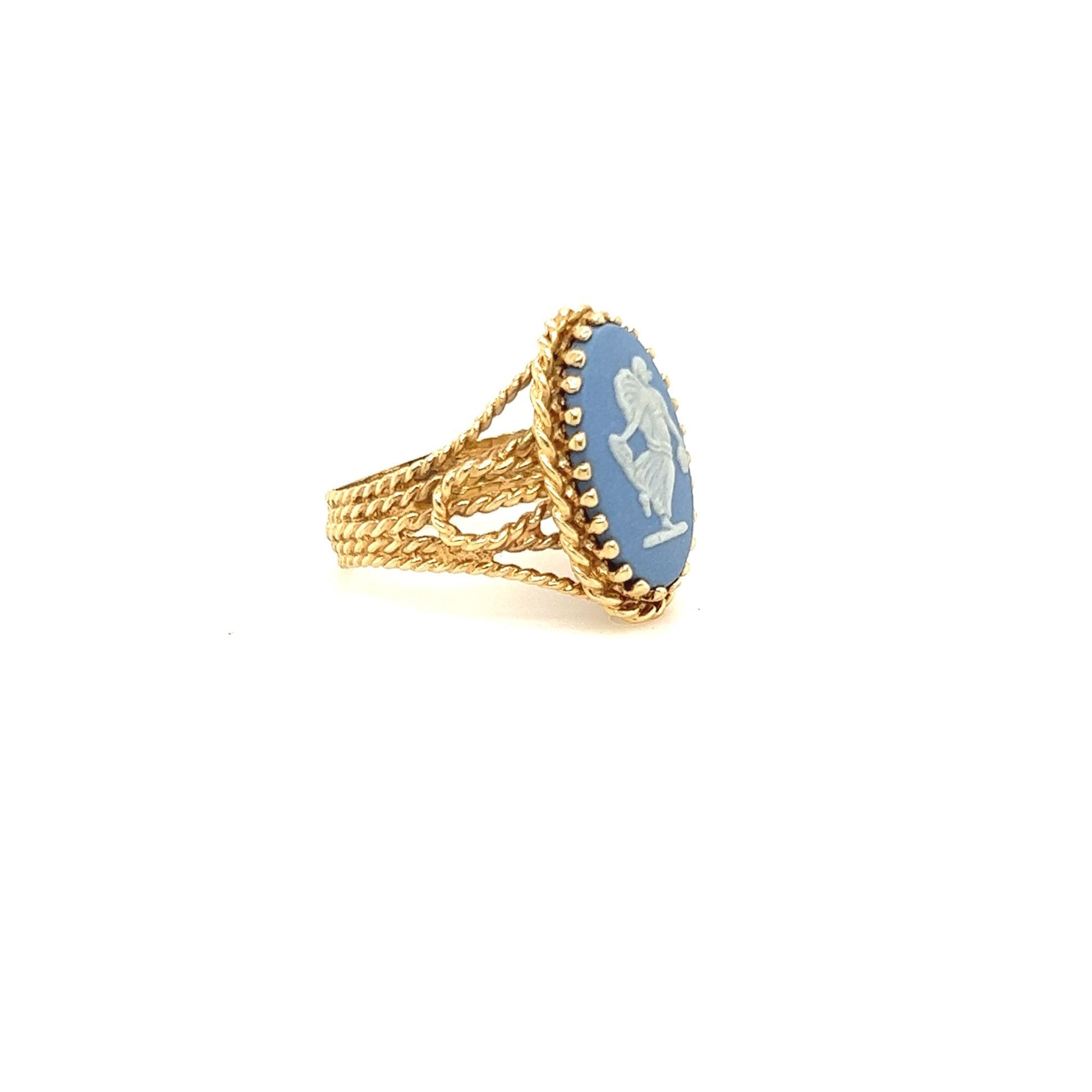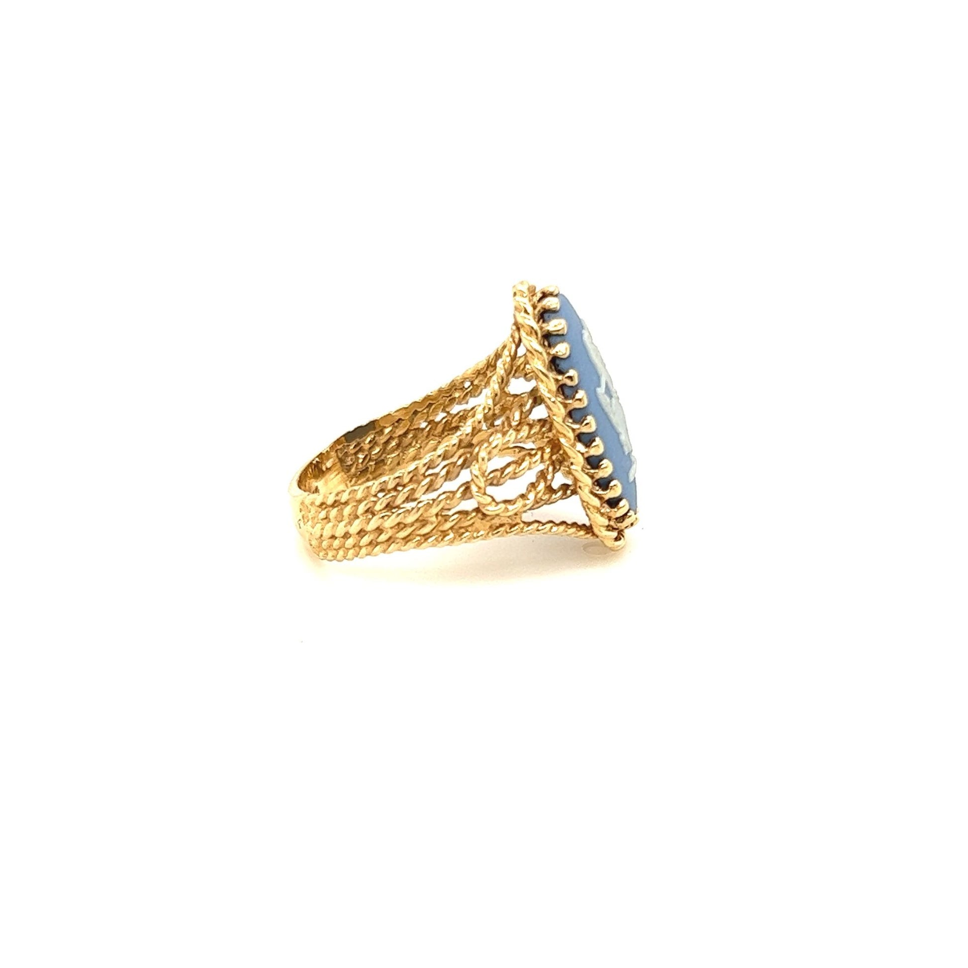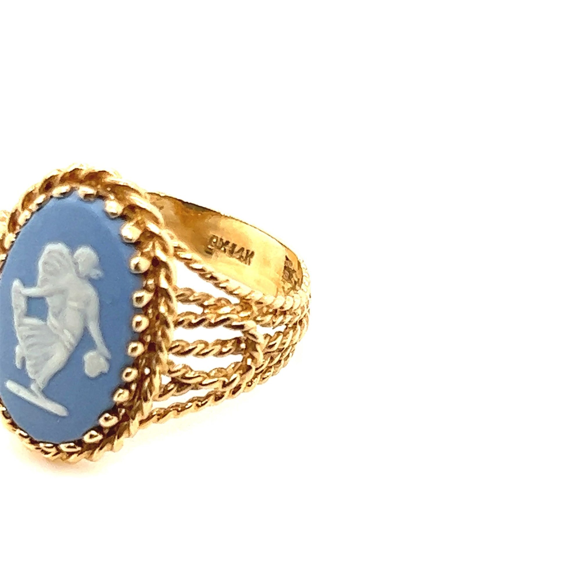 This exquisite ring is crafted in 14kt yellow gold and features a hand-carved blue Wedgewood angel design, creating a truly unique and captivating piece. The ring is designed to fit a finger size 6 1/2 and weighs approximately 3.9 grams.
