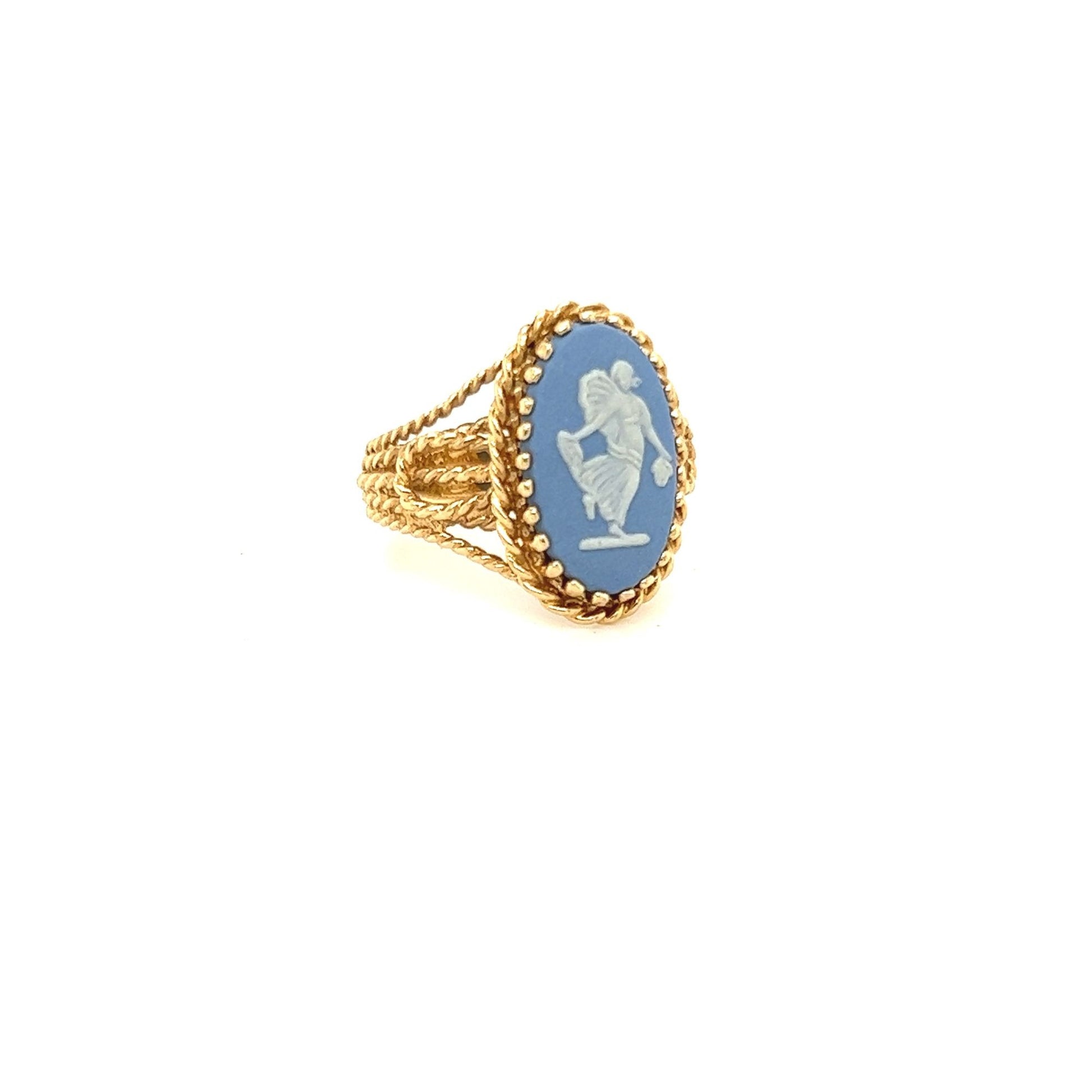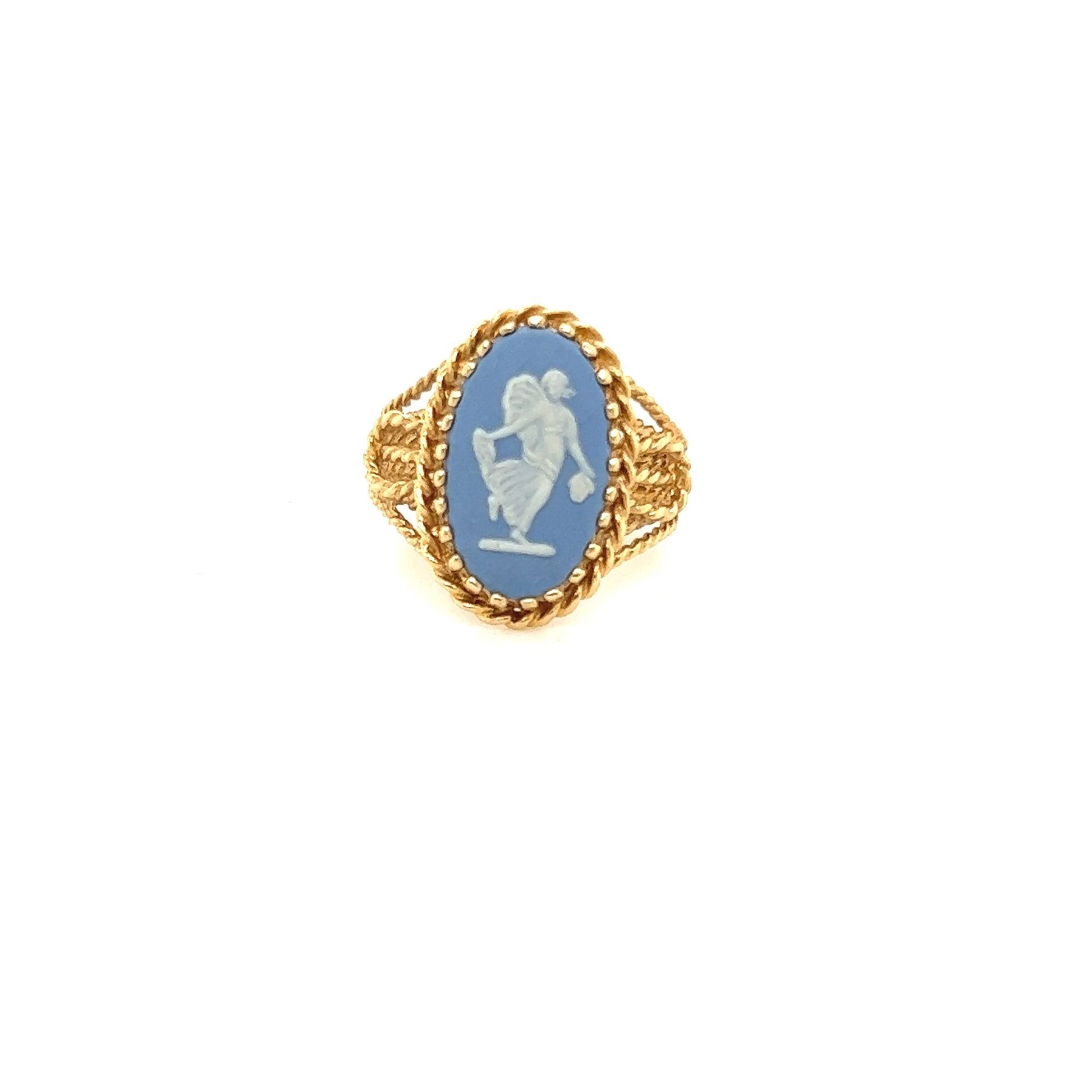 The centerpiece of the ring is the beautifully carved angel made from blue Wedgewood. The angel motif adds a touch of elegance and charm to the ring, showcasing intricate details and a delicate design. The blue color of the Wedgewood complements the warmth of the yellow gold setting, creating a harmonious contrast.