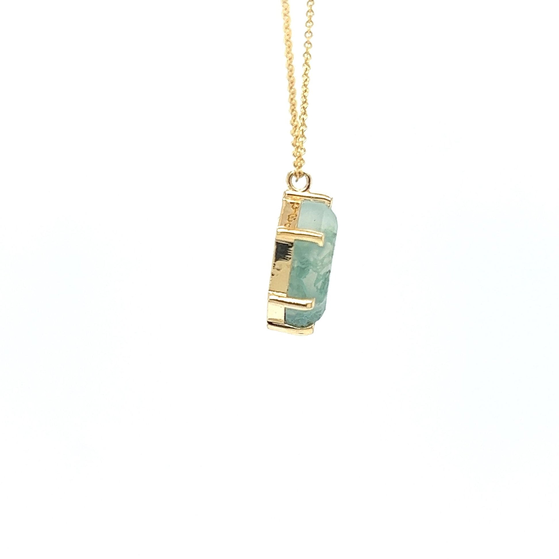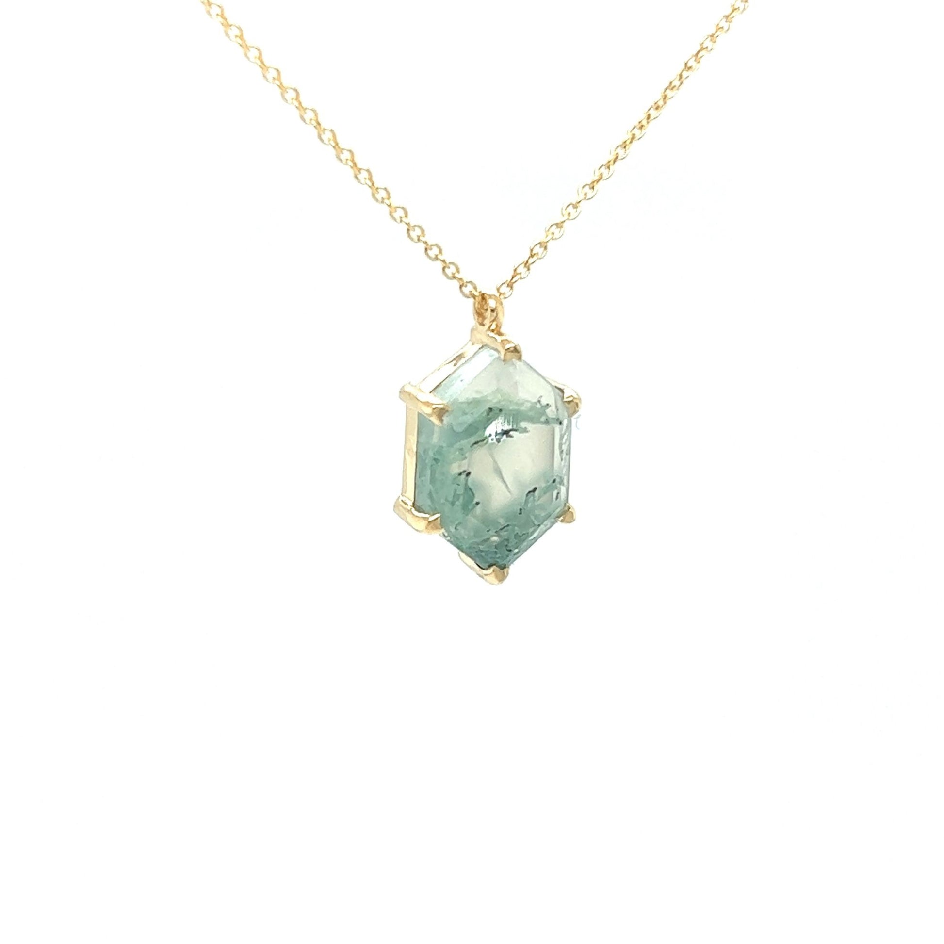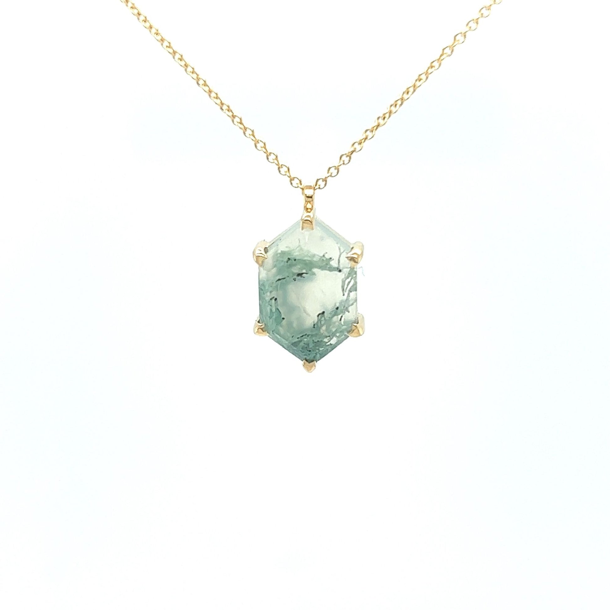 This 14kt yellow gold pendant is an eye-catching piece, featuring a hexagon cut green moss agate. The unique cut of the stone allows for maximum light reflection, enhancing its natural beauty.
