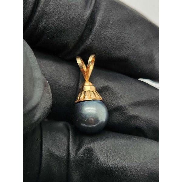 Embrace the elegance of the ocean with this exquisite 14kt yellow gold peacock Tahitian pearl pendant, featuring a lustrous 9.25-millimeter Tahitian pearl. This pendant is gracefully crafted and has a weight of approximately 0.5 pennyweights (dwt). It is adorned with a charming bunny ear bail for added character.