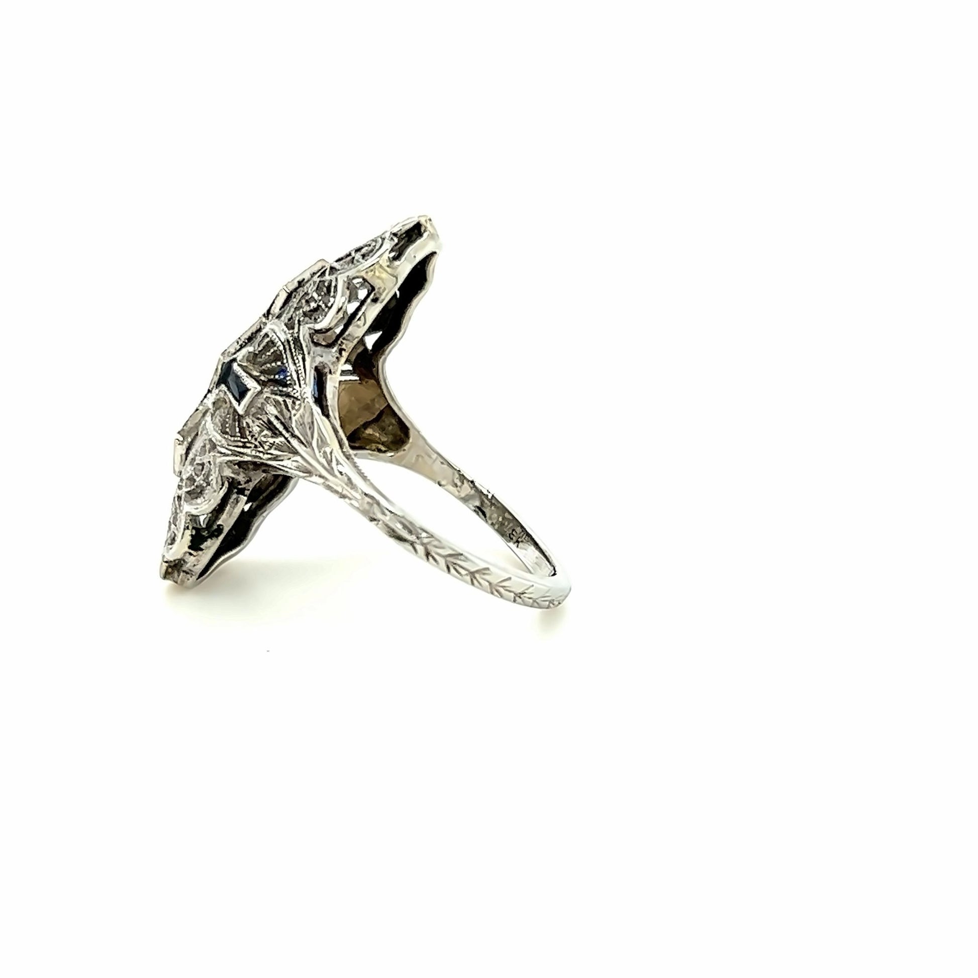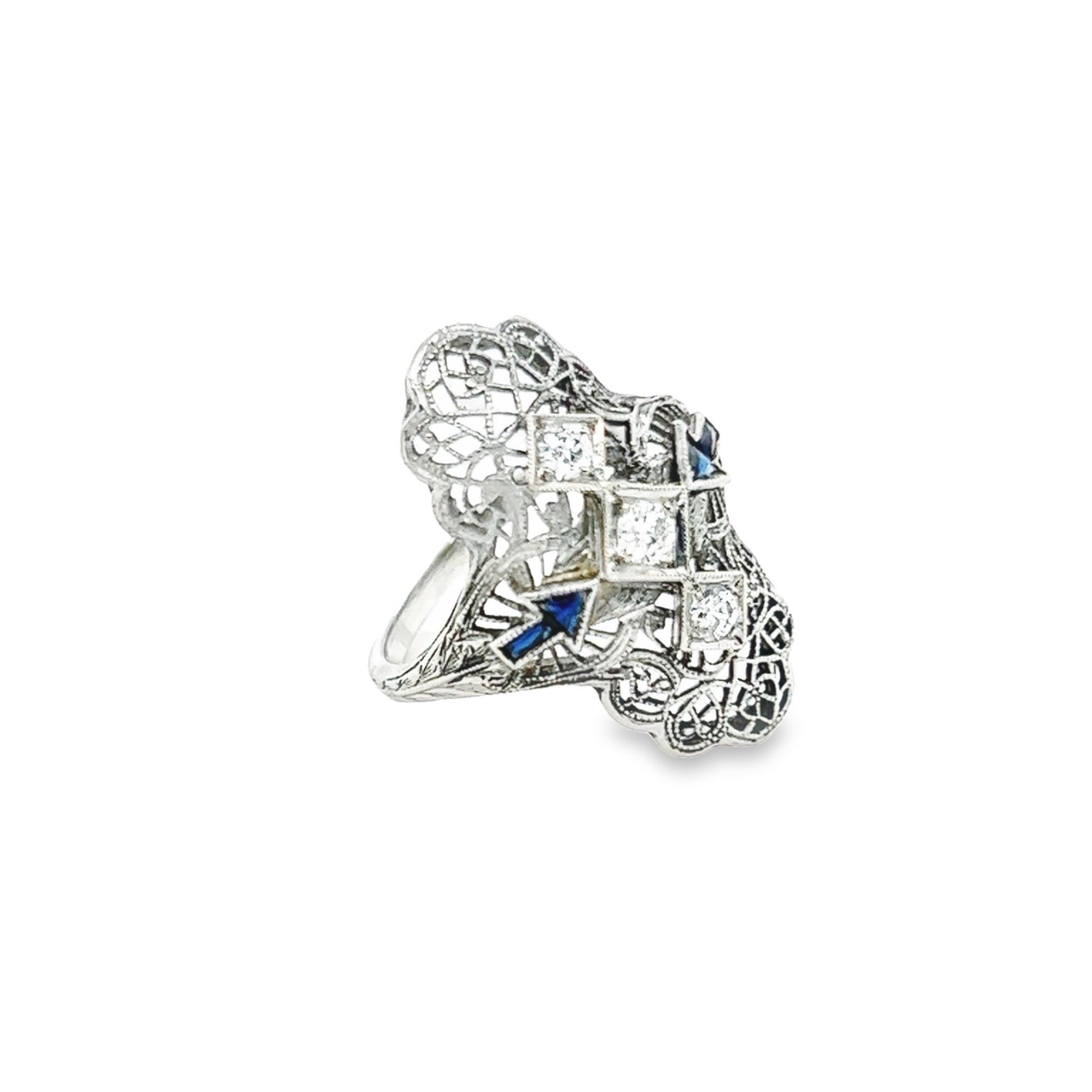 Introducing this exquisite 18kt vintage highly detailed white gold shield ring with diamonds and sapphires. The ring is a size 4 and weighs 3.4 grams, making it a comfortable and elegant accessory for any occasion.