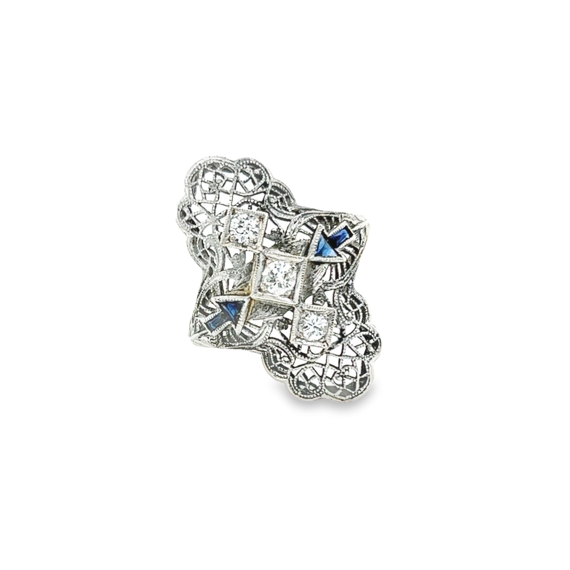 18kt Vintage Highly Detailed White Gold Shield Ring w/ Diamonds & Sapphires
