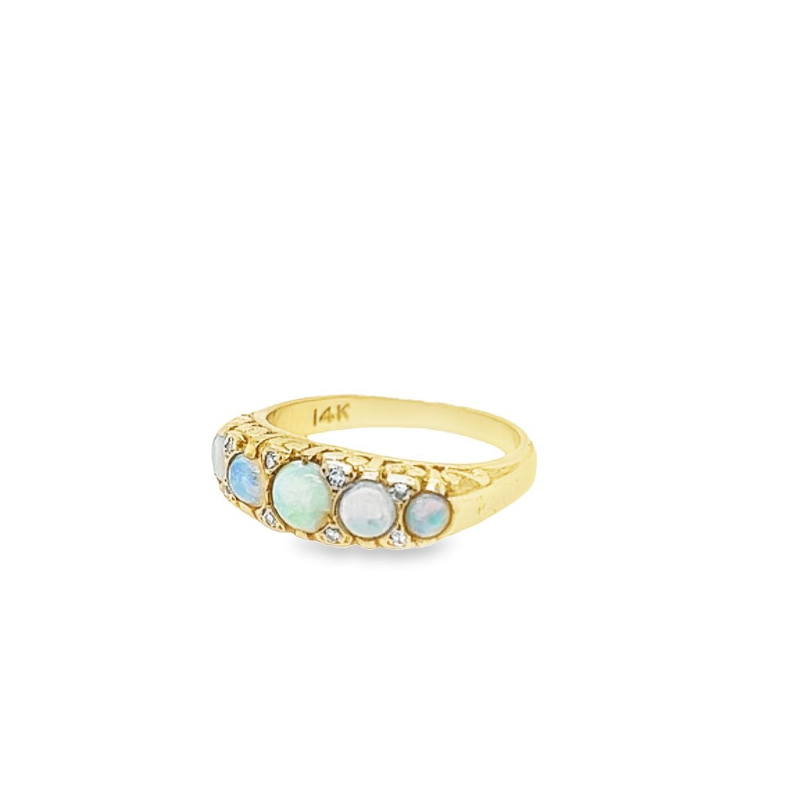 Crafted from high-quality 14kt gold, this ring exudes vintage charm and sophistication. The five opals are carefully set to showcase their stunning colors and unique play of light, while the diamonds add a touch of sparkle and elegance to the piece.