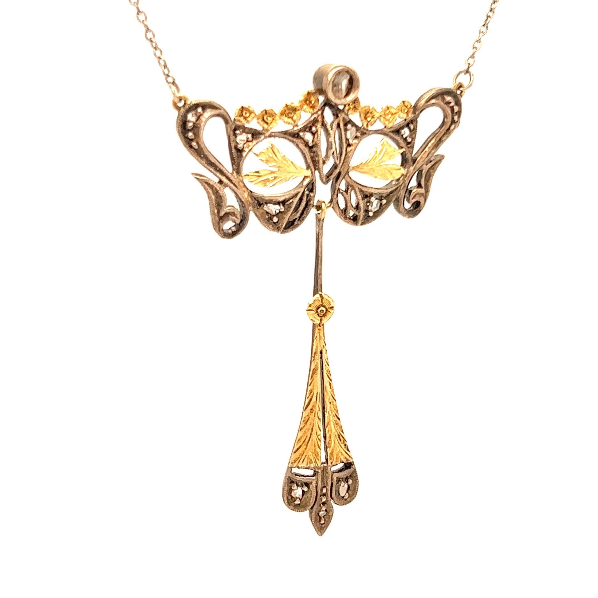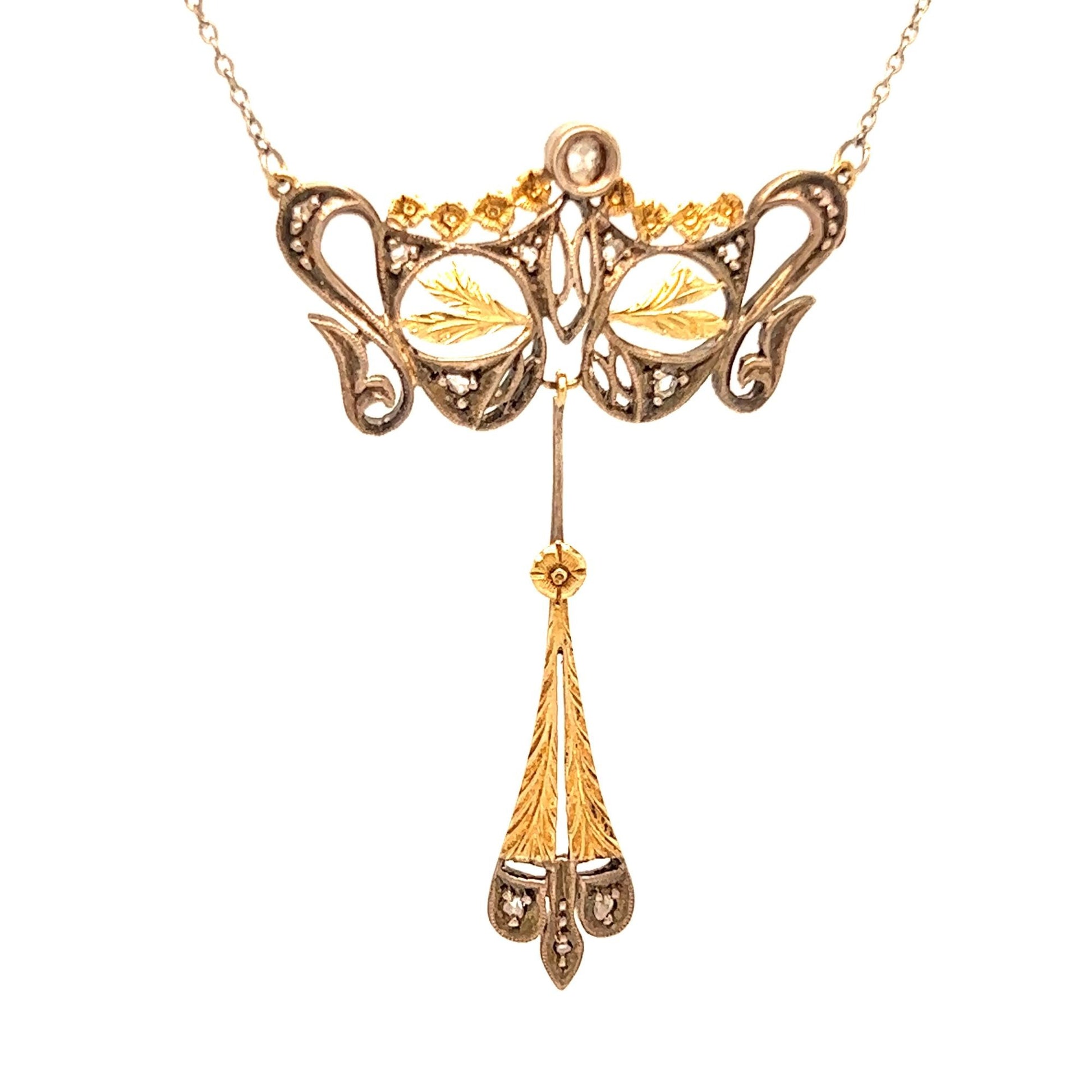 This vintage two-tone leaf and vine pendant is a true work of art. Crafted with exceptional attention to detail, this pendant features delicate leaves and vines in both yellow and rose gold, accented with shimmering rose-cut diamonds.